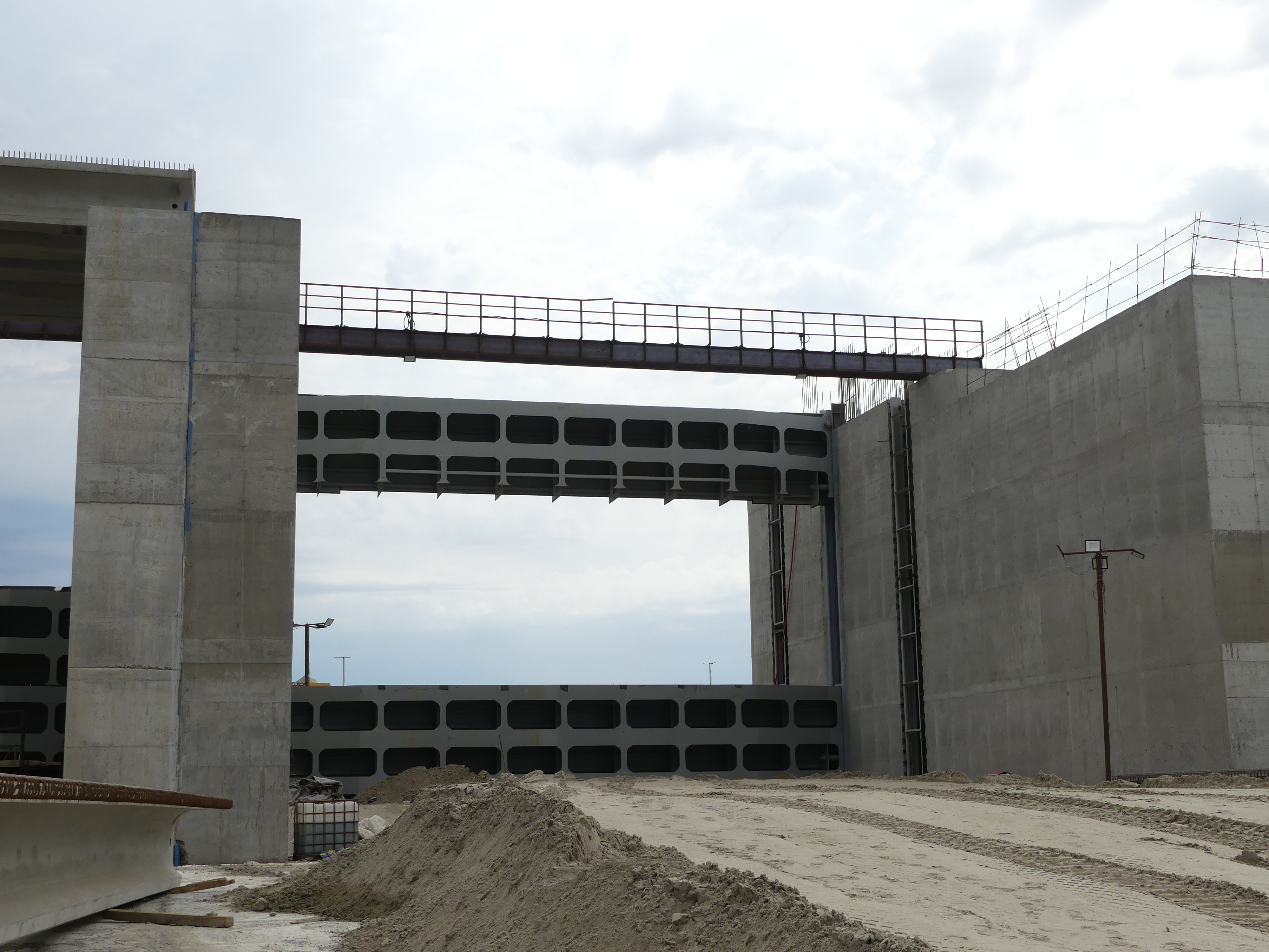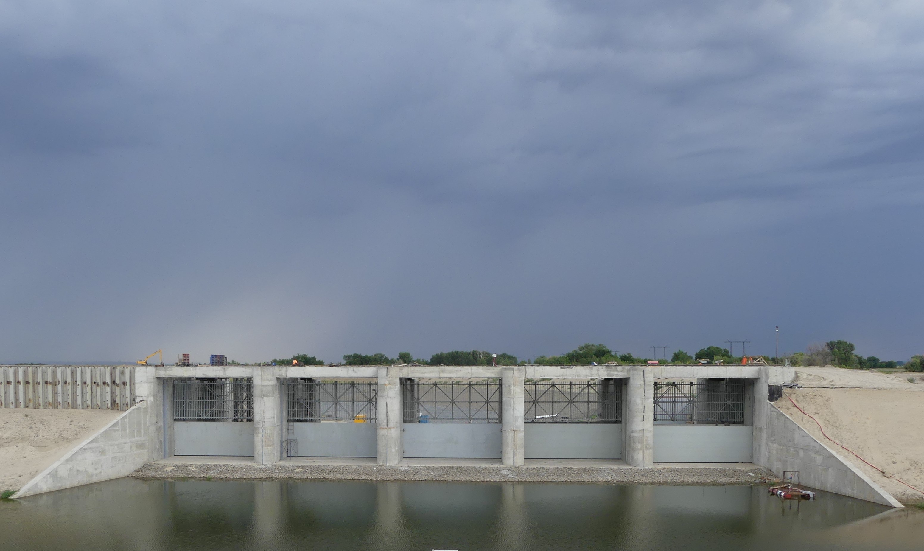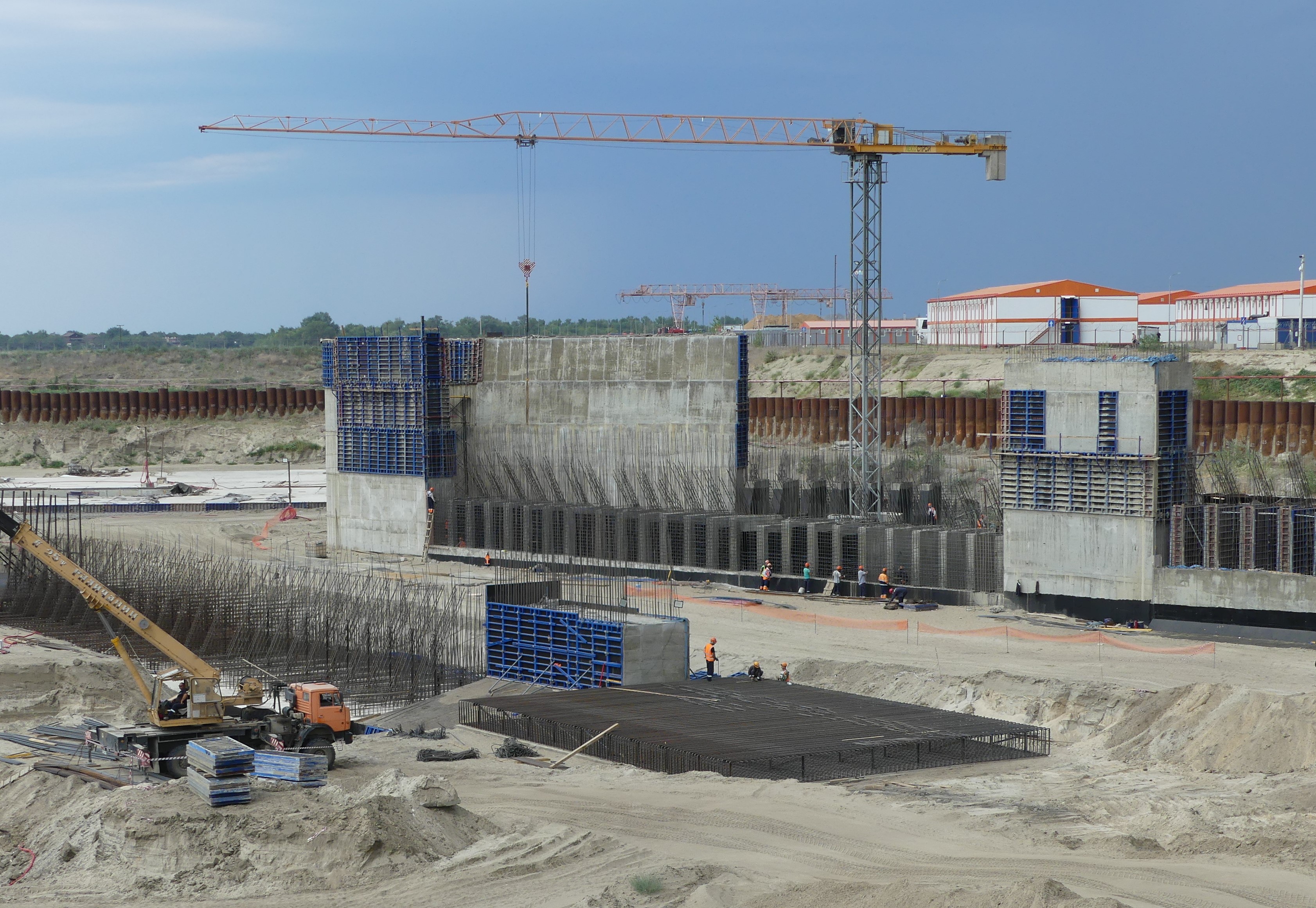 В июле было продолжено выполнение работ по бетонированию конструкций – активно велась укладка бетона в массивы водосбросной плотины и судоходного шлюза, всего за июль уложено свыше 20 тыс. м3. Общий объем уложенного бетона с начала строительства составил 214 000 м3, это 79% от проектного объема первого пускового комплекса. Для непрерывного обеспечения стройки бетоном на площадке работают три бетонных завода.