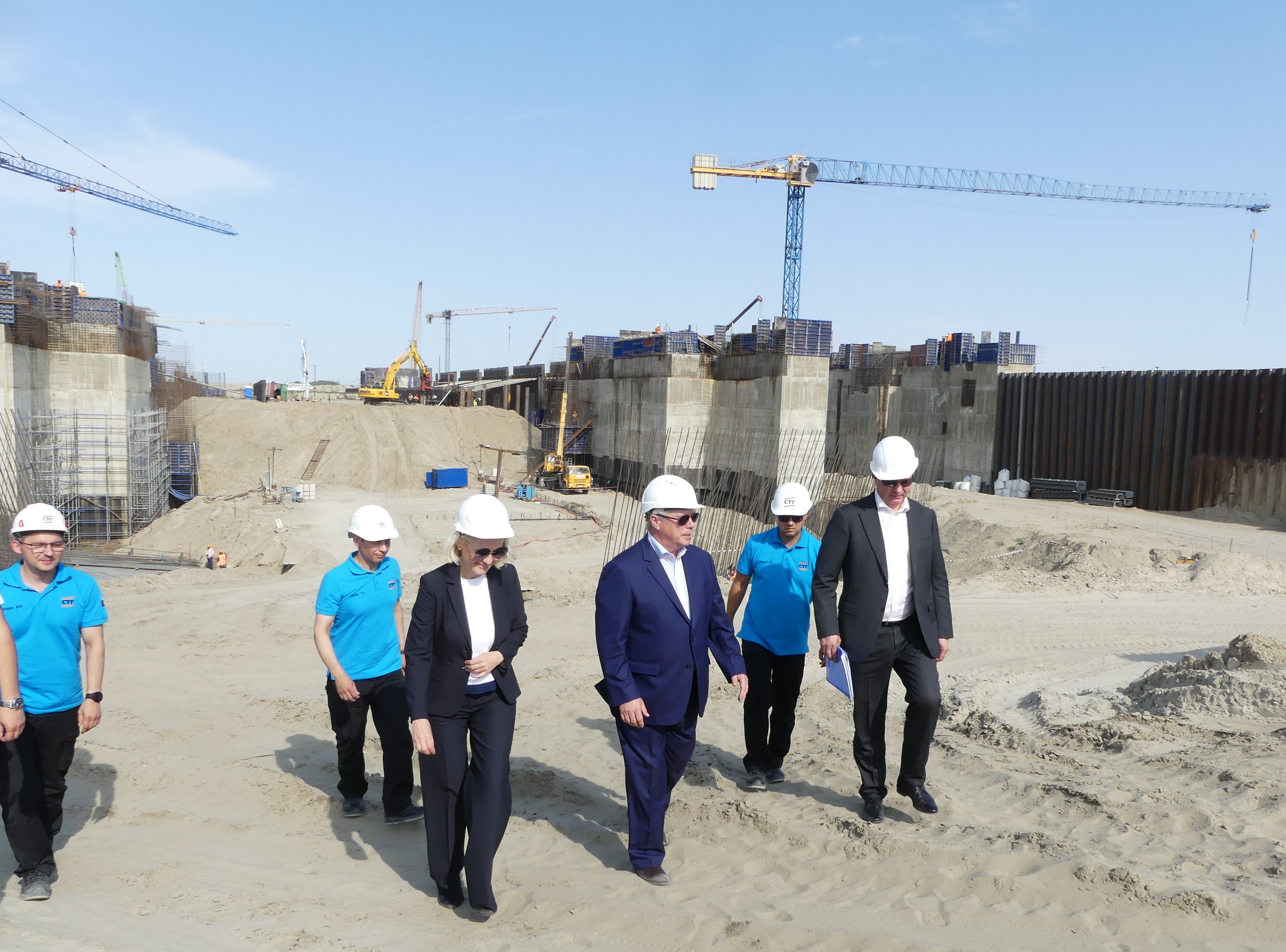 Цель визита – инспекция хода строительства основных гидротехнических сооружений 2-го этапа: водосбросной плотины, нижней головы судоходного шлюза, головного регулятора рыбоходно-нерестового канала. Все эти объекты первого пускового комплекса планируется ввести в эксплуатацию во 2-м квартале 2025 года, с началом навигации.